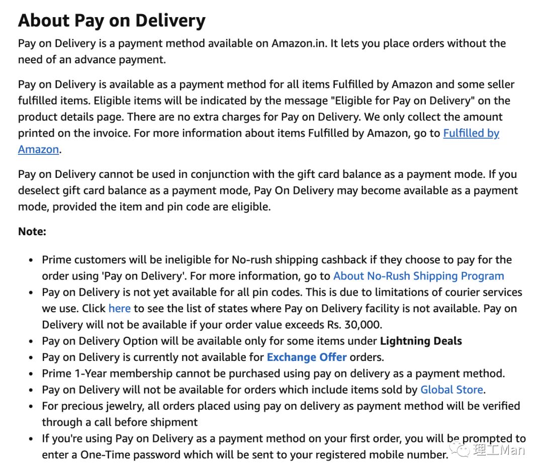 Amazon作为行业老大哥,在印度市场也是提供货到付款的服务,Amazon称之为POD (Pay on Delivery)。我们来看看Amazon对于货到付款的一些限制说明: